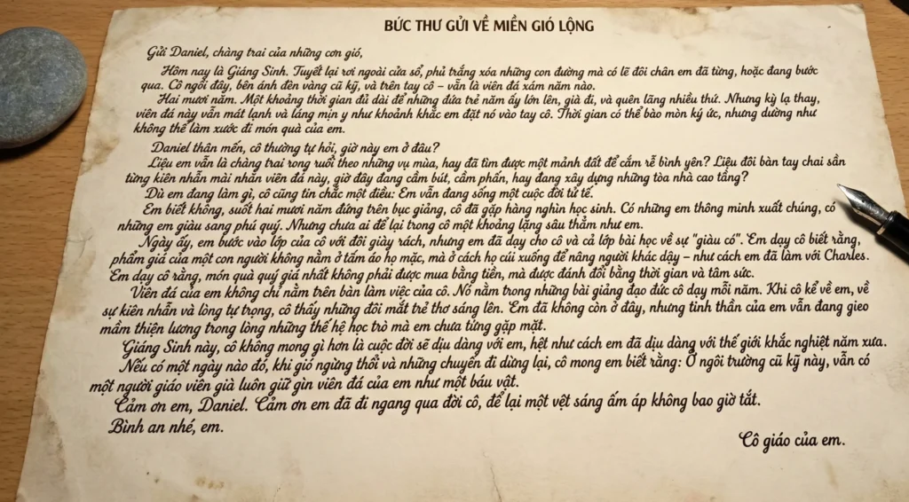 Nếu có một ngày nào đó, khi gió ngừng thổi và những chuyến đi dừng lại, cô mong em biết rằng: Ở ngôi trường cũ kỹ này, vẫn có một người giáo viên già luôn giữ gìn viên đá của em như một báu vật.